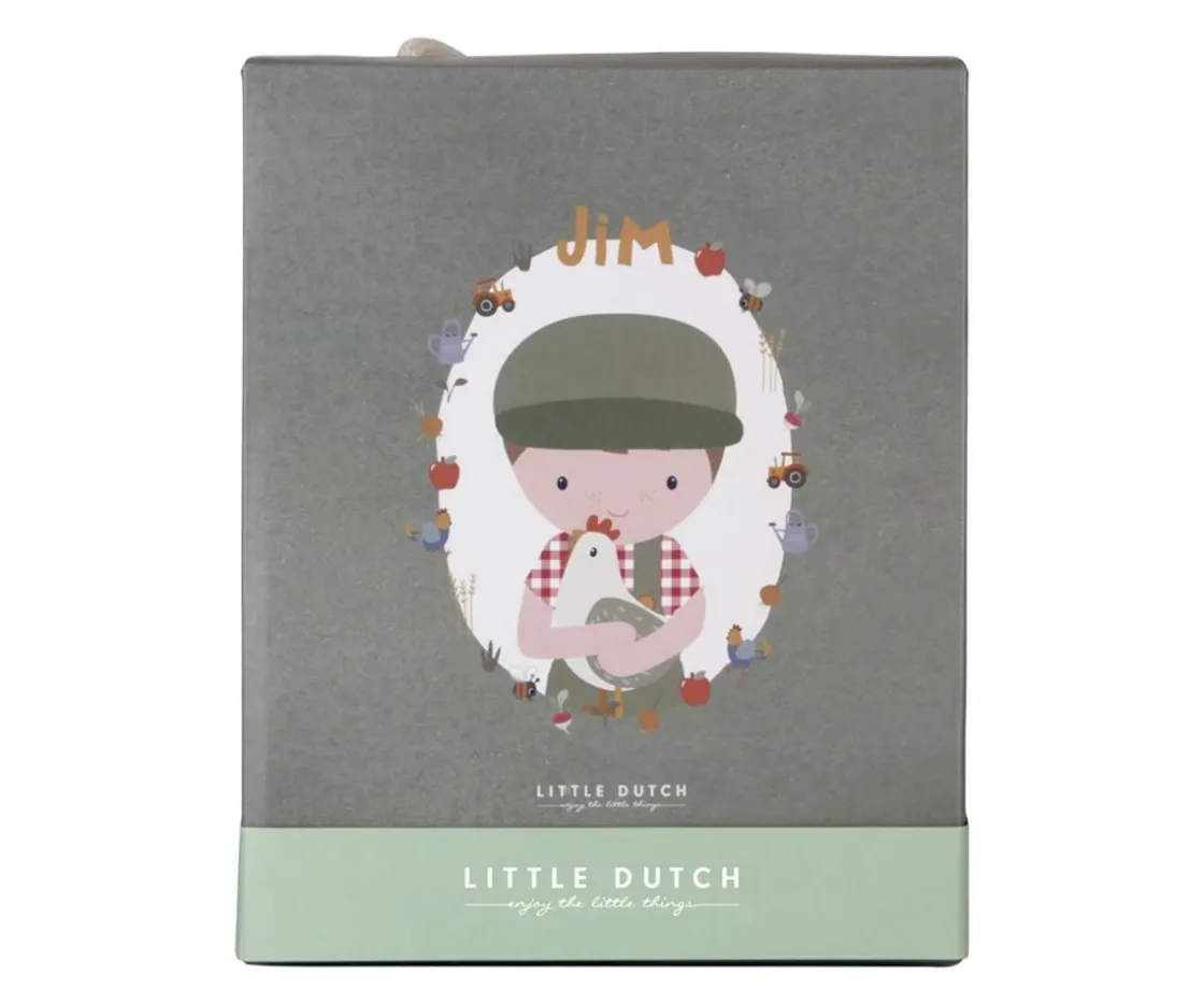 Jim es un adorable muñeco de felpa muy suave y encantador para darle buenos abrazos. Viste con un mono de pana sage y lleva consigo a su pequeña gallinita, que los peques podrán quitar y colocar entre sus brazos.