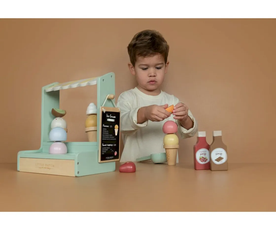 Con seis sabores para elegir, tres cucuruchos para llenar y una variedad de aderezos coloridos, los peques podrán explorar e imitar ser un heladero.