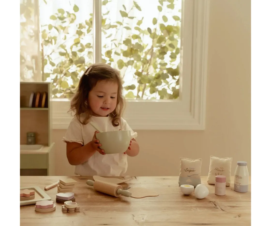 Incluye todos los ingredientes esenciales para una receta perfecta, desde el bol y el rodillo hasta la bandeja con galletas y toppings de colores. Ideal para usar con la cocinita de Little Dutch o cualquier rincón de juego.