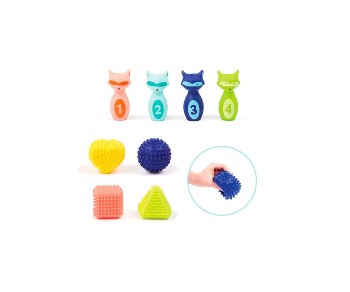 - Incluye: juego de bolos con pelota sensorial, 24 piezas de foam tipo puzzle para construir o utilizar como alfombra y 3 piezas geométricas de goma apilables