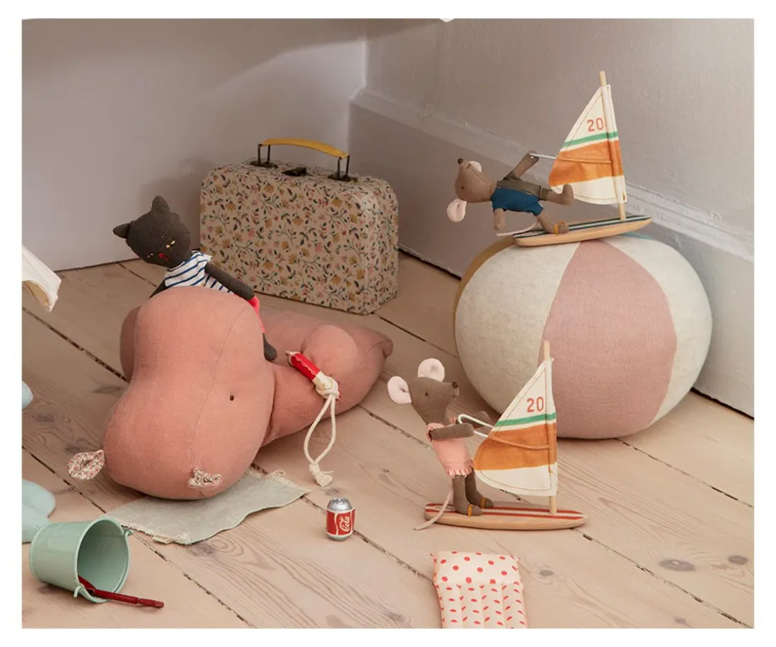 La ratoncita hermana pequeña de Maileg está preparada para surfear las olas los días soleados de playa. Lleva puesto un traje de baño y una tabla de surf de madera.
