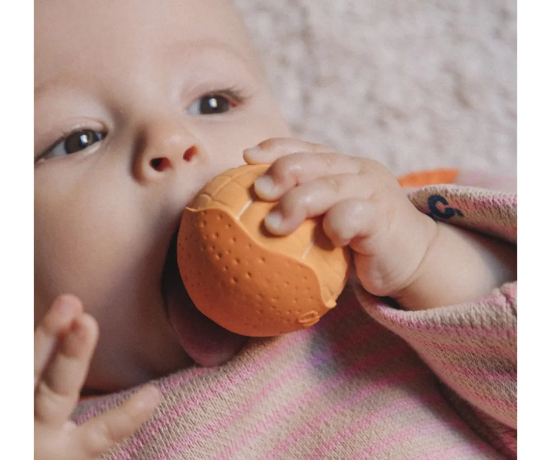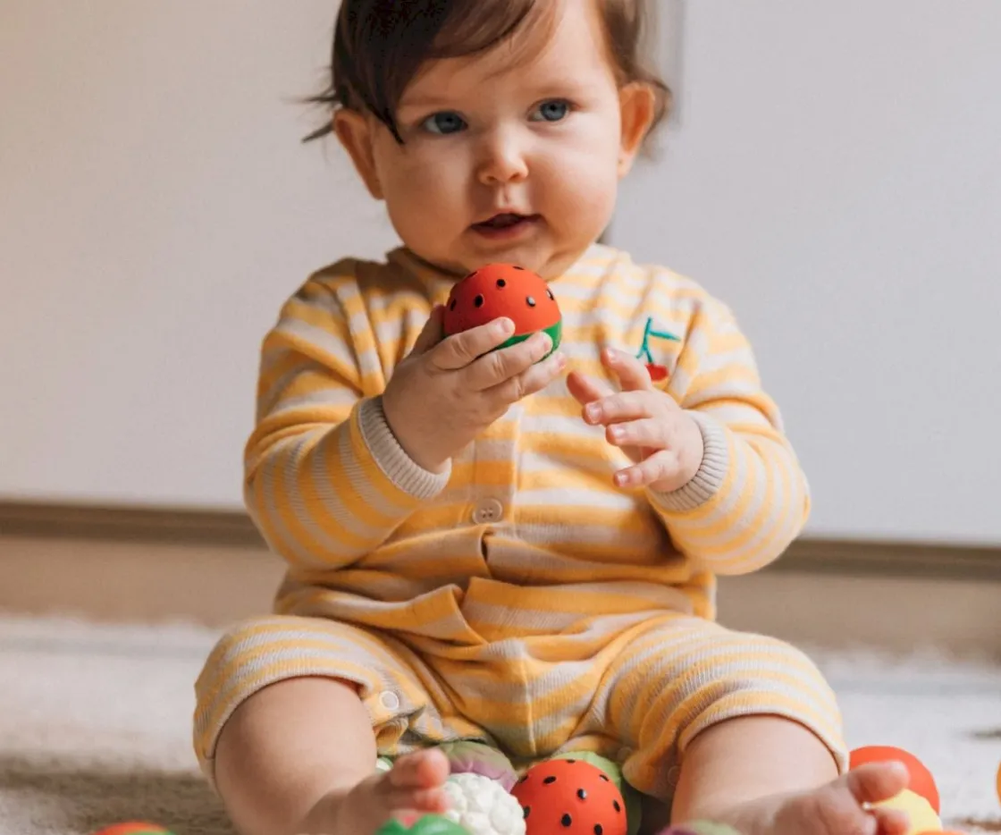 Set de 3 mini pelotas para que los bebés aprendan hábitos saludables y potencien su desarrollo sensorial. Este set Fruit Salad de Oli&Carol, cumple la función de mordedor, pelota sensorial y juguete de baño, fabricados en caucho 100% natural de árboles Hevea.