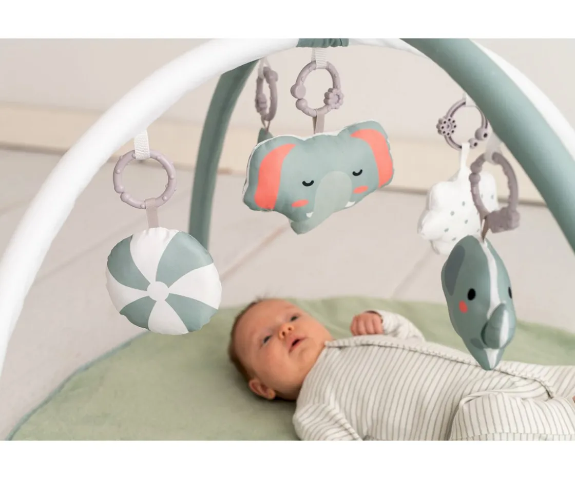 El gimnasio de actividades color Mint de Olmitos, incluye arcos y 5 juguetes sensoriales para acompañar a tu pequeño desde sus primeros días. Además de estimular el desarrollo motor, visual y cognitivo; también proporciona un espacio acogedor y seguro para el juego. Su base es antideslizante y a medida que el peque crezca, se puede retirar los arcos y juguetes para utilizar solamente como manta de actividades.