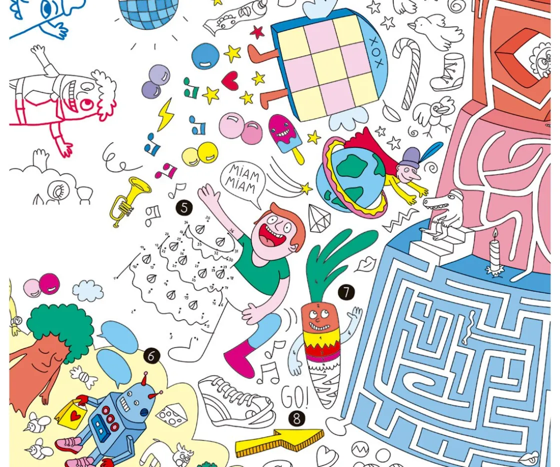 Original póster gigante + lápiz de doble punta con un lado de grafito y otro de 5 colores con el que los peques se divertirán buscando donde están los diferentes juegos y coloreando.
