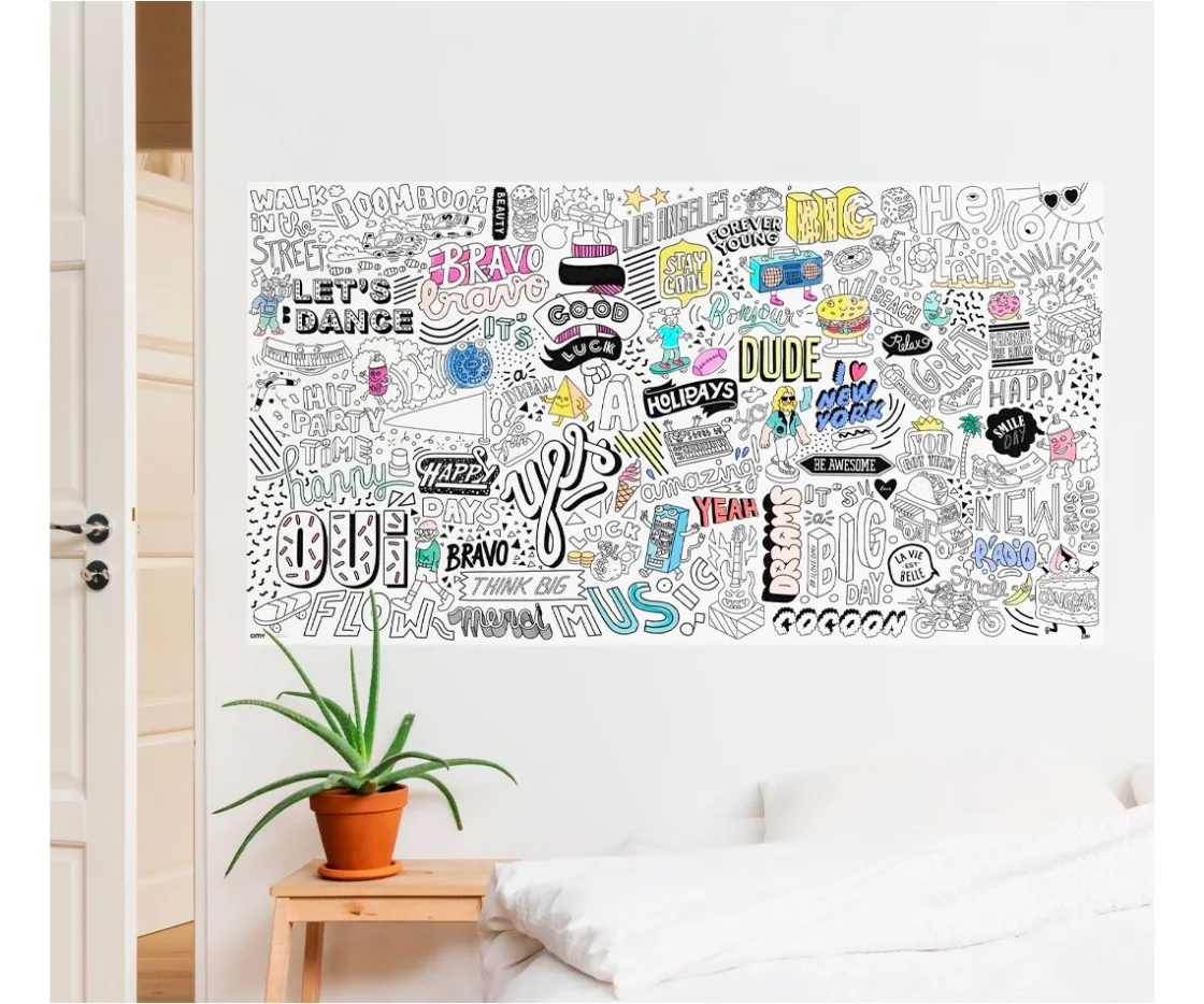 Póster gigante para colear con temática de ilustraciones, letras y graffitis. Los peques podrán divertirse coloreándolo solos, con la familia o amigos y una vez terminado lo podrán desplegar en el suelo, colgar en la pared o usar como mantel.