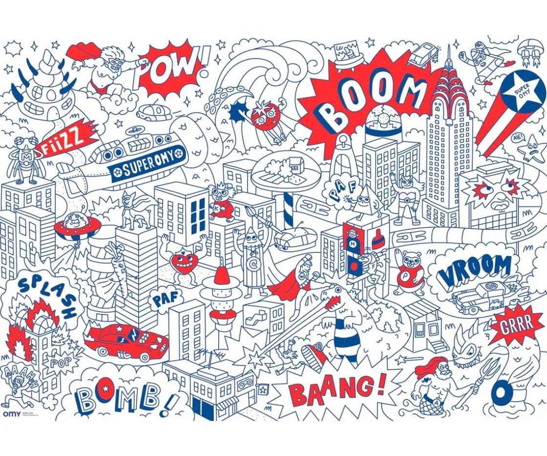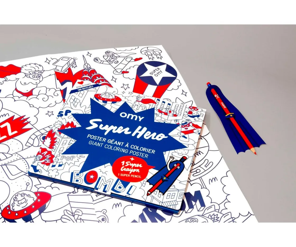 Póster gigante para colear con temática de superhérores que incluye un súper lápiz rojo. Los peques podrán divertirse coloreándolo solos, con la familia o amigos y una vez terminado lo podrán desplegar en el suelo, colgar en la pared o usar como mantel.