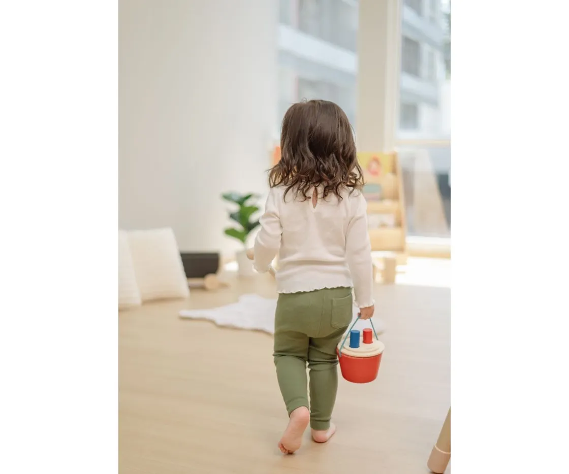 A medida que los clavijas desaparecen dentro del cubo, los pequeños exploran el concepto de permanencia del objeto, levantan la tapa para recuperarlas y refuerzan la resolución de problemas y el aprendizaje por ensayo y error. Además, el juego introduce formas básicas, fomentando la manipulación, rotación y encaje de objetos en los agujeros correspondientes, alineándose con los principios Montessori.
