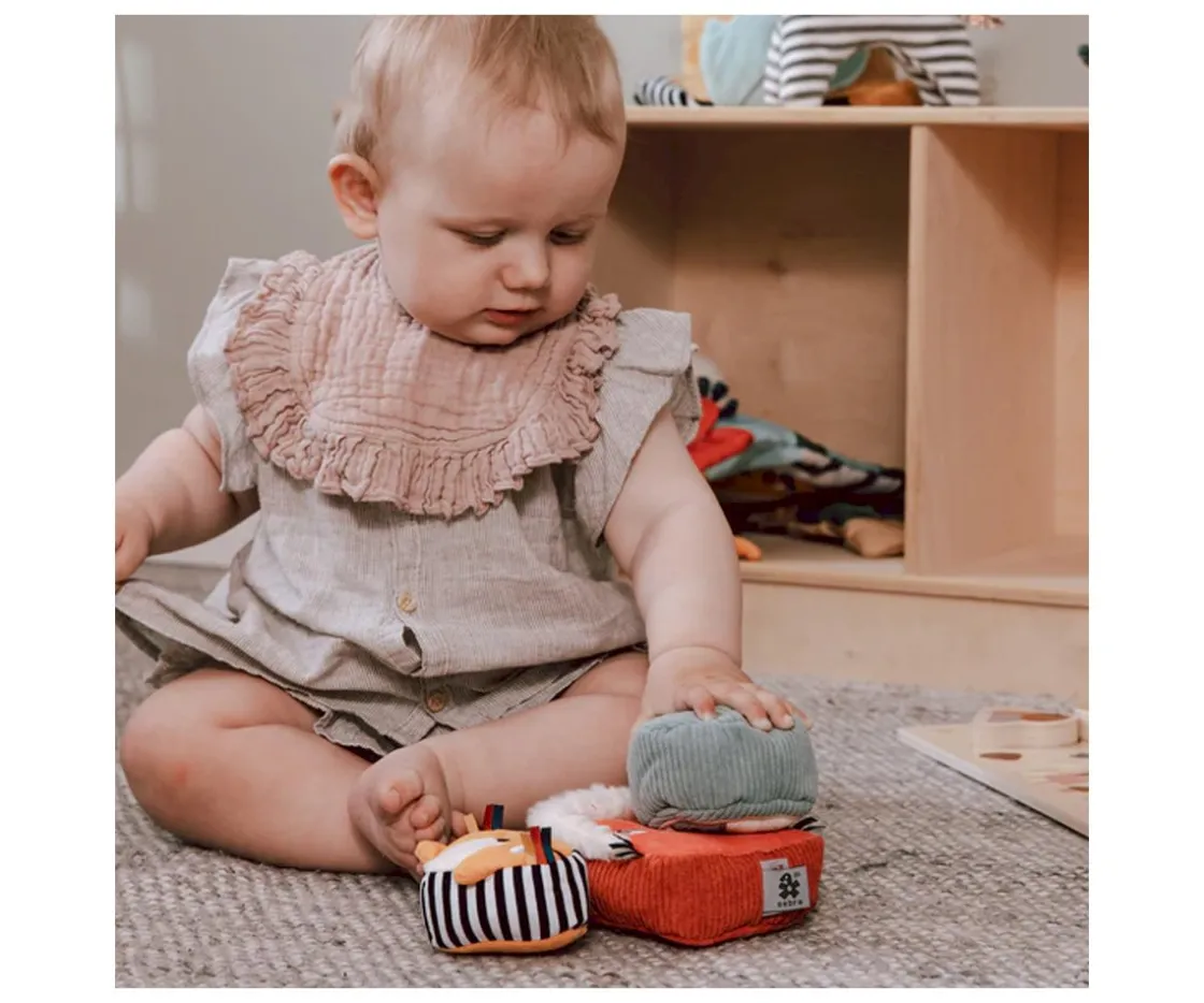 Estos bloques tienen superficies texturizadas,formas geométricas, etiquetas y hasta un sonajero, para ofrecer a los peques una gran cantidad de estímulos sensoriales y visuales.