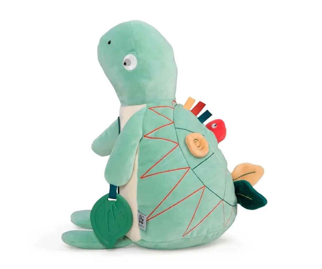 En su barriguita cuenta con un espejo en el que a los peques les encantará observar sus expresiones faciales y movimientos, tiene hojas crujientes, etiquetas y cuenta con un mordedor en forma de hoja verde.