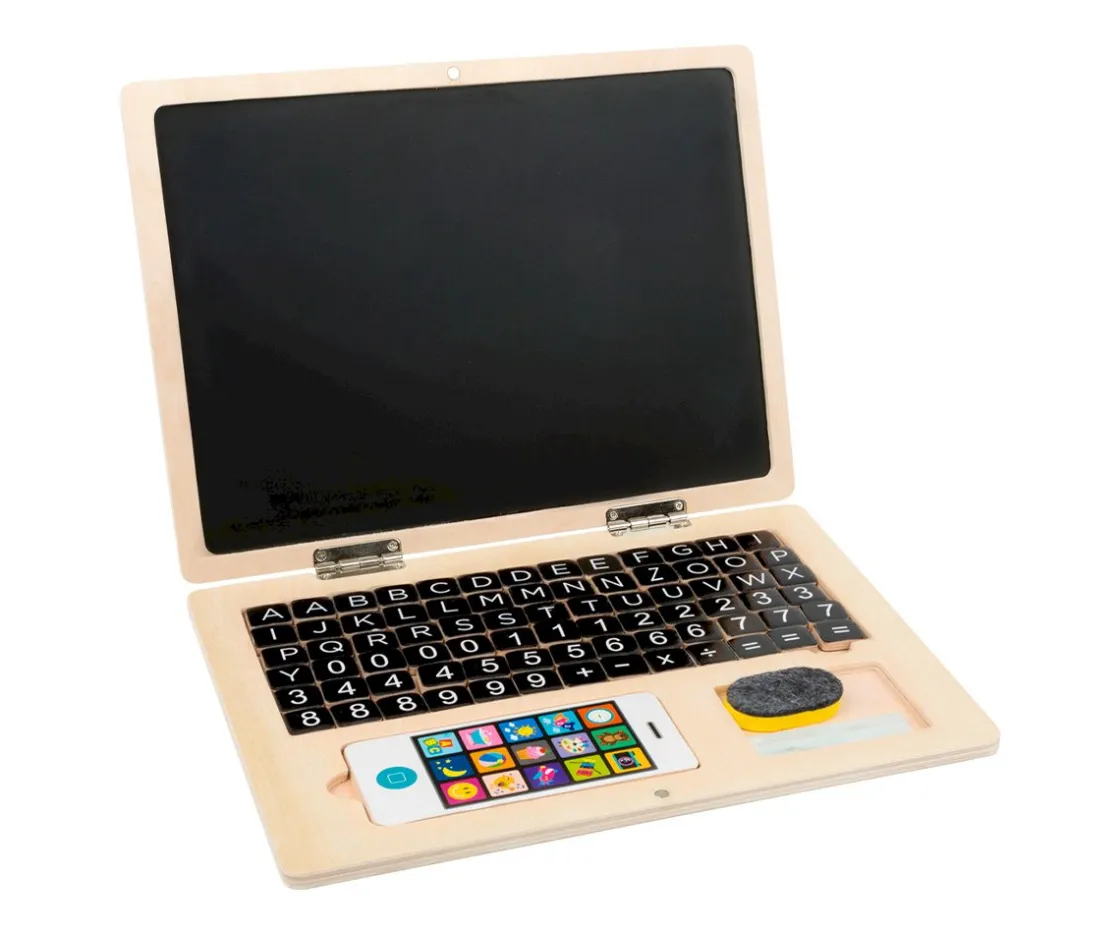 - Incluye: portátil de madera con 78 imanes, 1 esponja, 1 teléfono móvil de madera, 2 tizas