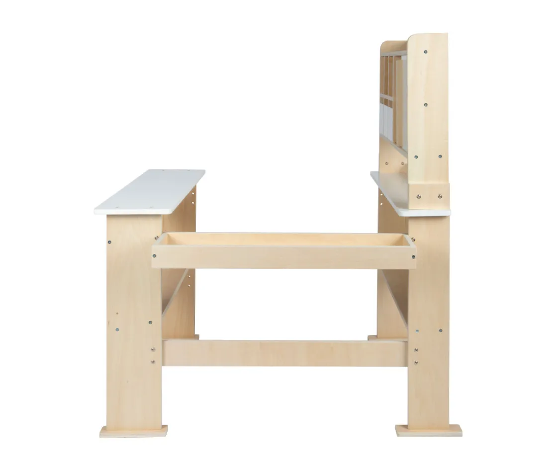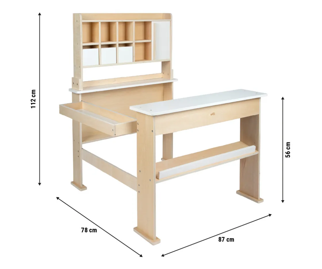 La tienda de madera de Small Foot cuenta con una amplia encimera, tres cajones, una puerta corredera trasera y un compartimento lateral, proporcionando mucho espacio para organizar frutas, verduras, productos envasados y todo tipo de artículos.