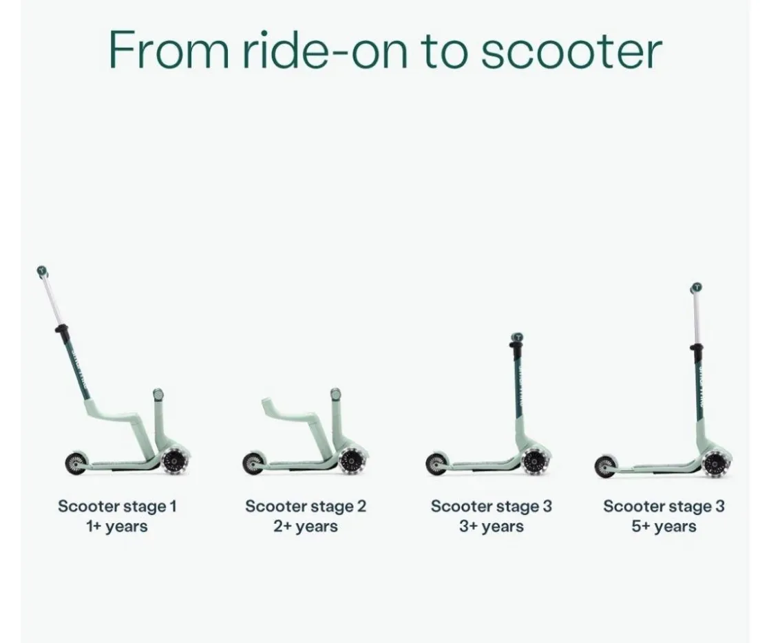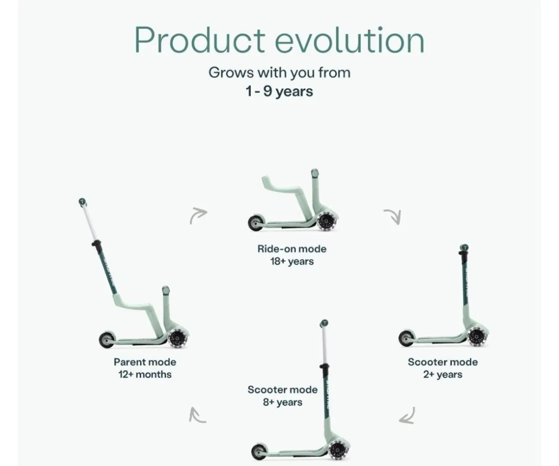 Desde una bicicleta para caminar acompañado, un scooter, hasta un patinete con manillar extensible para adaptarlo a la altura de tu peque por lo que este patinete pueden utilizarlo desde un añito hasta los 9.Cuenta con un práctico y cómodo asiento para sus dos primeras etapas.