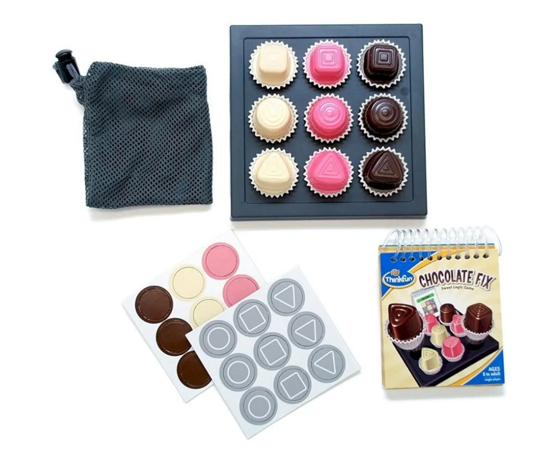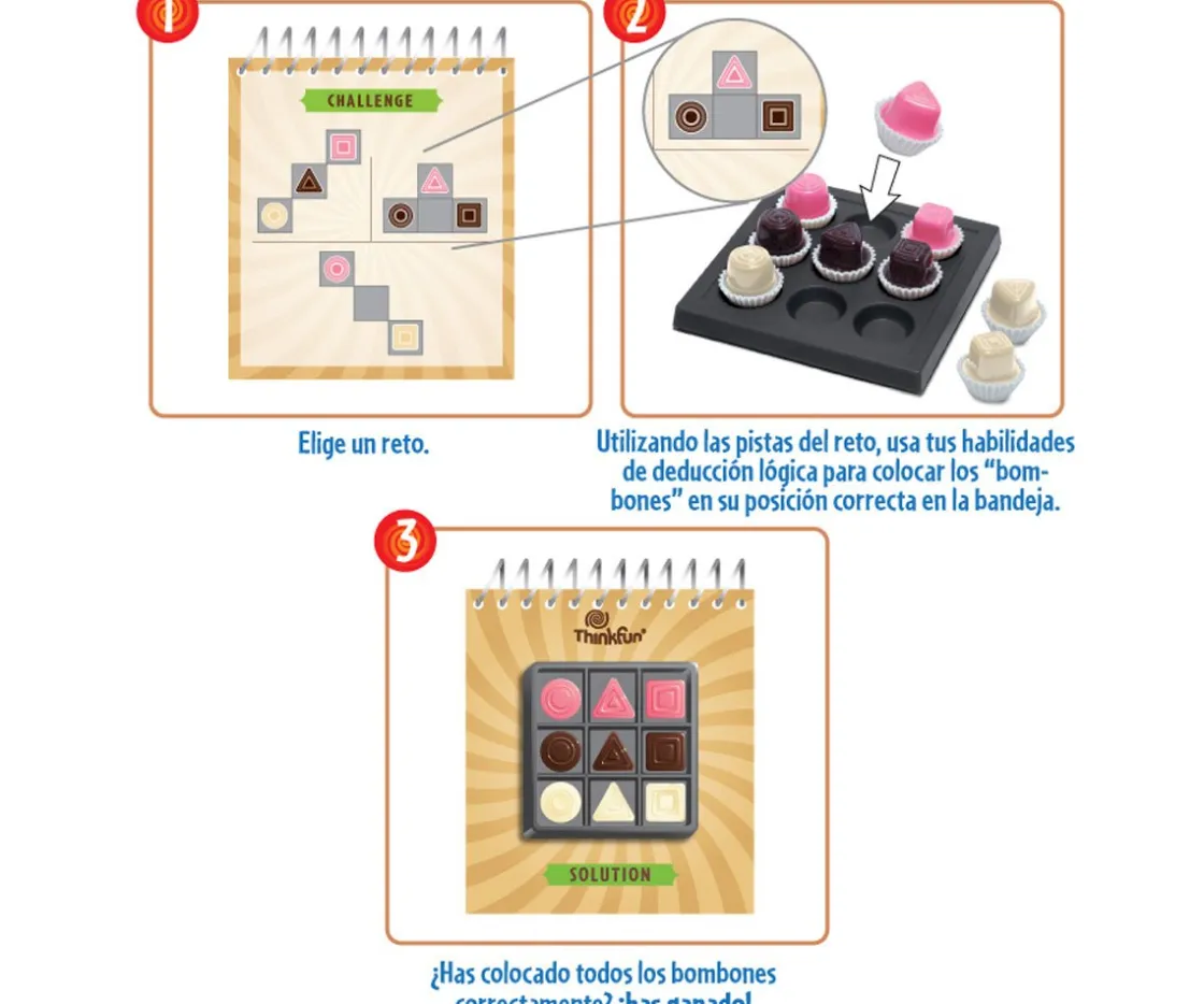 - Incluye: 40 retos con soluciones(diferentes niveles de juego), 1 bandeja para bombones, 9 bombones, 18 marcadores de posición, 1 bolsa de viaje