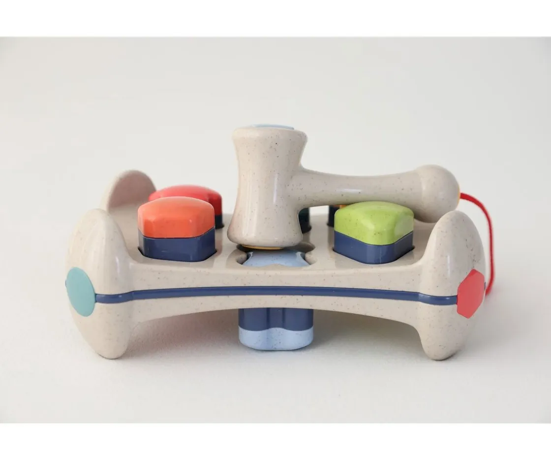 Incluye un martillo unido al banco por una cuerdecita para que los peques puedan martillar las formas. Cada forma emite un sonido al moverlas o agitarlas.
