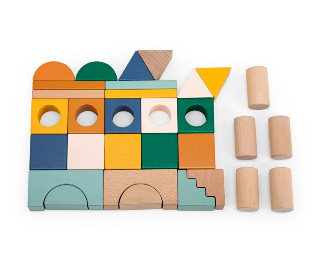 - Incluye 31 bloques (con 6 cilindros encajables de animalitos)