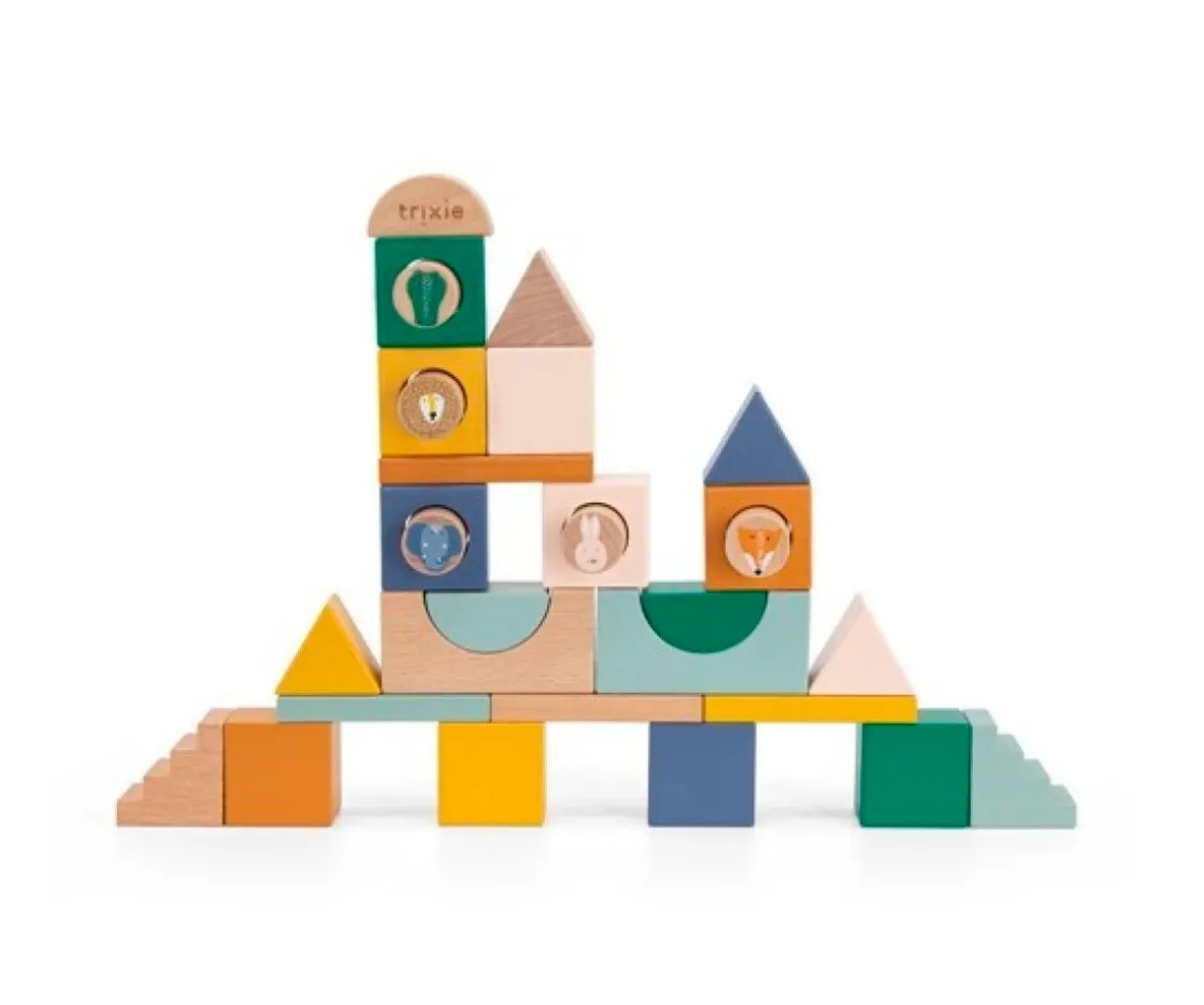 Este juego de construcción está formado por 31 bloques de diferentes formas y colores, con cilindros que caben en los bloques cuadrados con diseños de los animalitos Trixie.