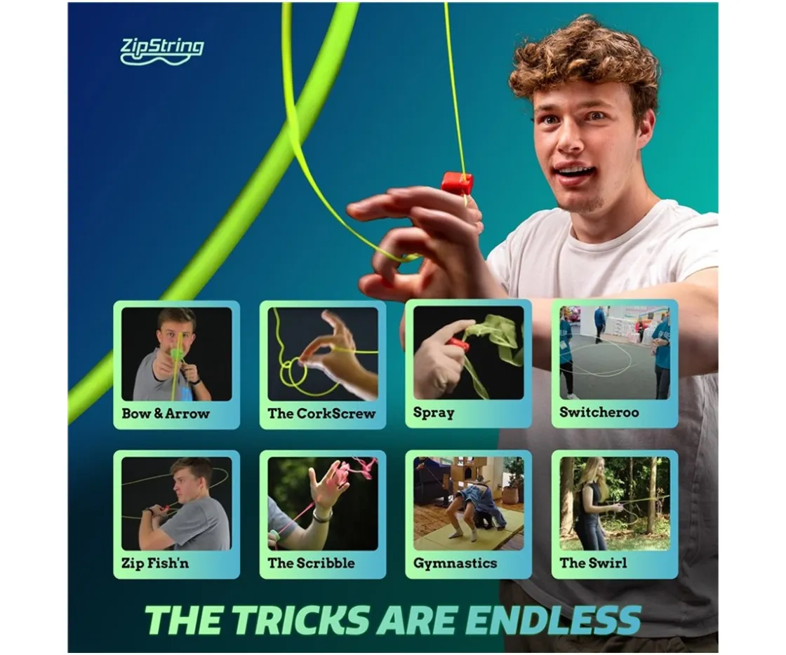 - Incluye: 1 lanzador ZipString, 3 cuerdas de colores y tamaños diferentes (S-Fácil, M-Medio, L-Extremo)