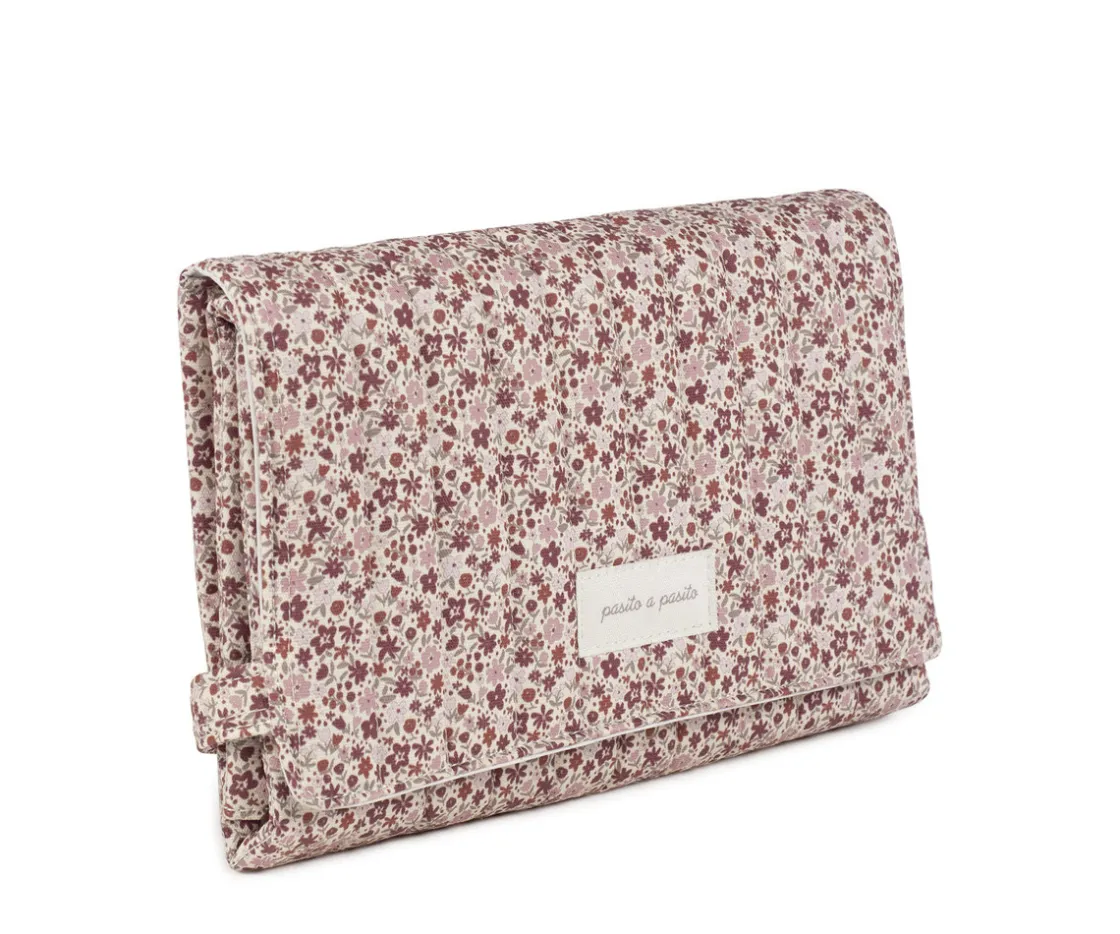 El cambiador de bebé Cherry Flores de Pasito a Pasito es práctico, elegante y fácil de transportar. Confeccionado en algodón 100% con un delicado tejido de rayas, cuenta con forro interior acolchado e impermeable para mayor comodidad e higiene. Perfecto para llevar en la bolsa de maternidad.