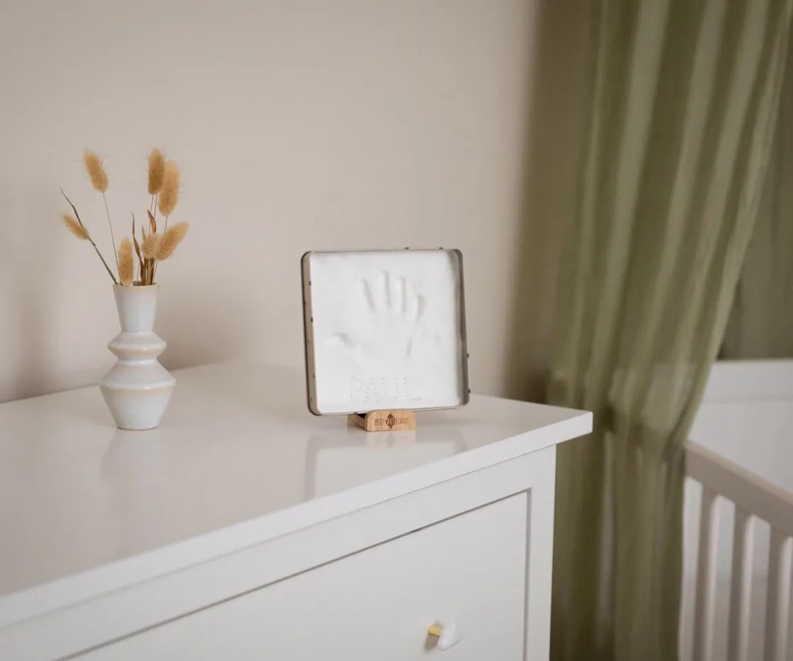 Cajita de huellas de tu bebé que podrás colocar como marco gracias a su soporte de madera.Un recuerdo único en el que podrás hacer huellas de manos o pies de tu peque.