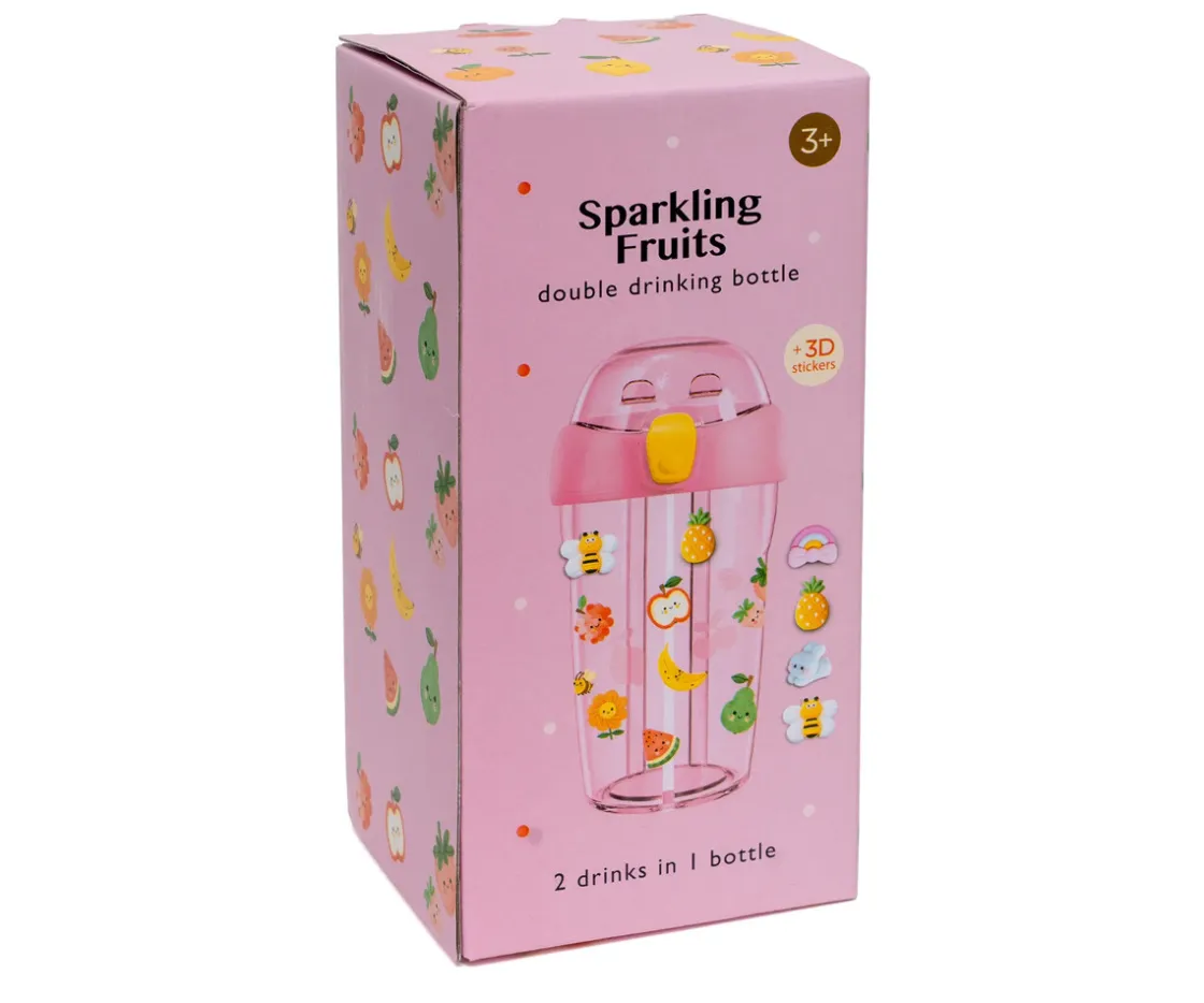 La botella infantil 2 en 1 de Petit Monkey Sparkling Fruits es mucho más que una simple botella de agua: gracias a sus dos compartimentos independientes, permite transportar dos bebidas diferentes en un único recipiente. Ideal para la escuela, excursiones o salidas familiares.