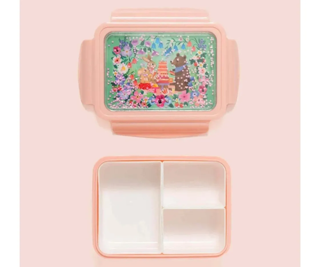 Preciosa y colorida caja de almuerzo adornada con un precioso diseño de animalitos del bosque.