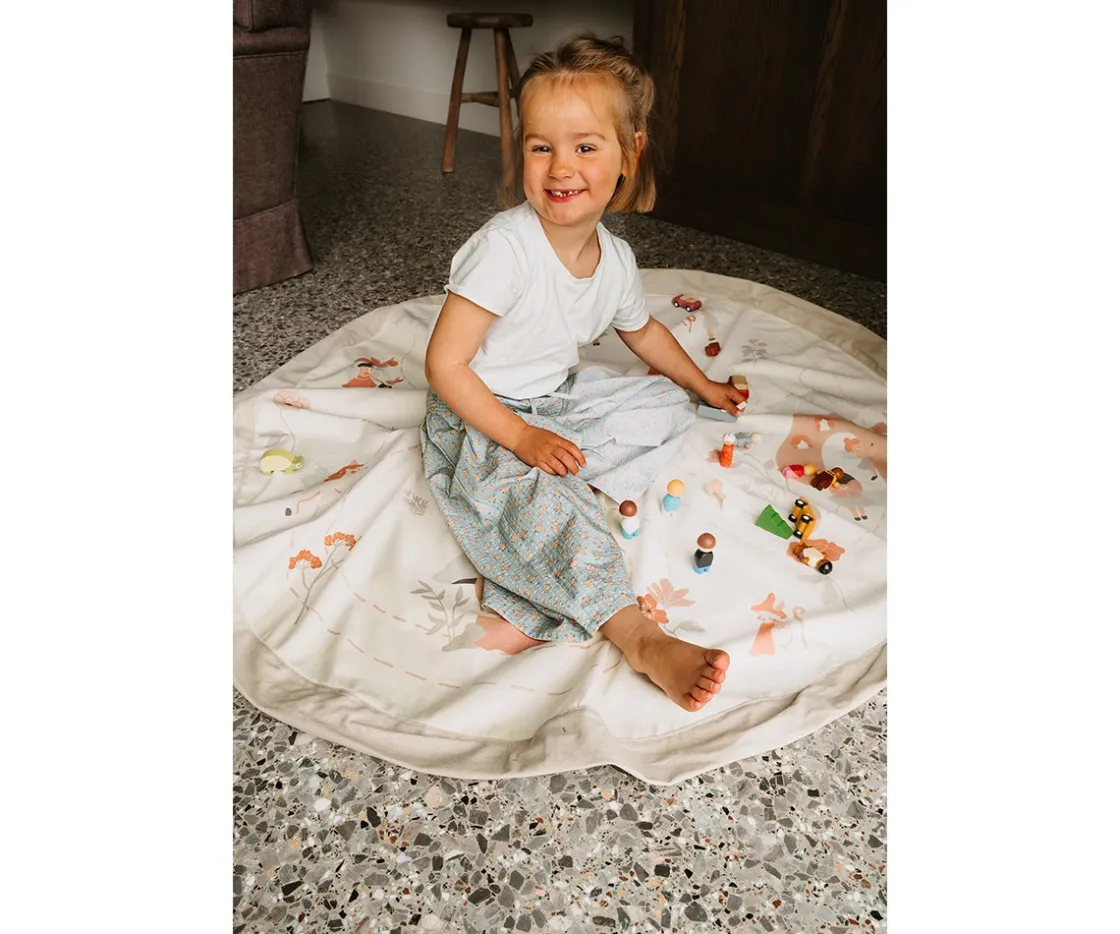 Este saco se desdobla y se convierte en una manta de juegos donde el niño puede jugar con todas sus juguetes, grandes y pequeños, y cuando llega la hora de acostarse, sólo hay que cerrarla y ya está todo recogido.
