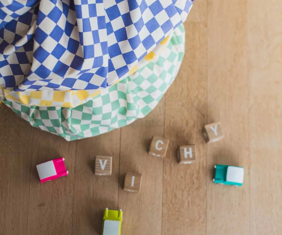 Este saco se desdobla y se convierte en una manta de juegos donde el niño puede jugar con todos sus juguetes, grandes y pequeños, y cuando llega la hora de acostarse, sólo hay que cerrarla y ya está todo recogido.