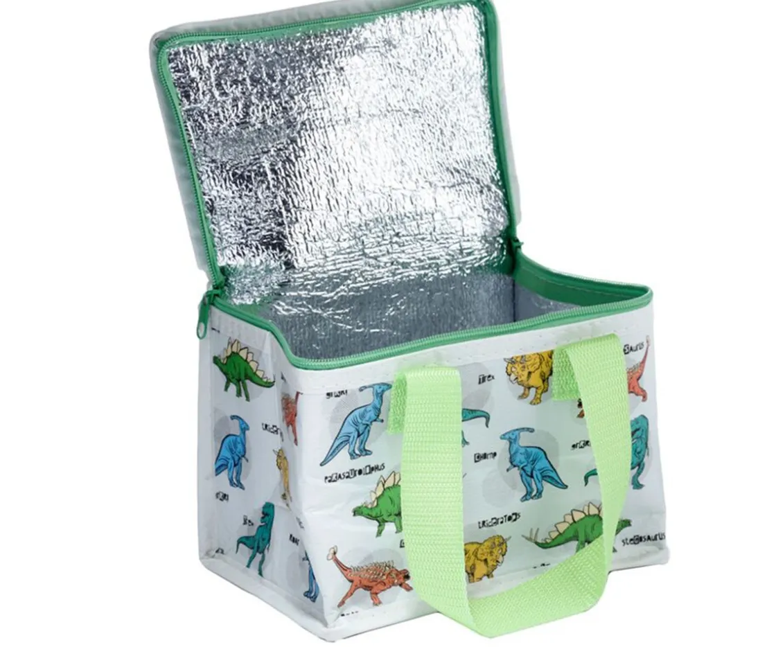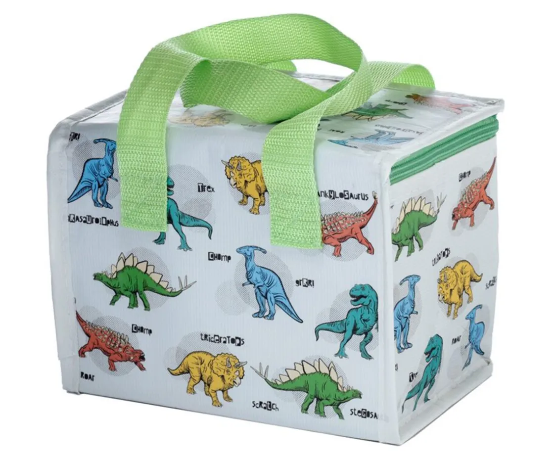 Bolsa térmica de merienda con diseño de diferentes dinosaurios y con sus nombres de Puckator. Fabricada a partir de botellas recicladas, es ligera y tiene el tamaño ideal para llevar almuerzos o meriendas. Con cierre de cremallera y asas cortas, es muy fácil de transportar.