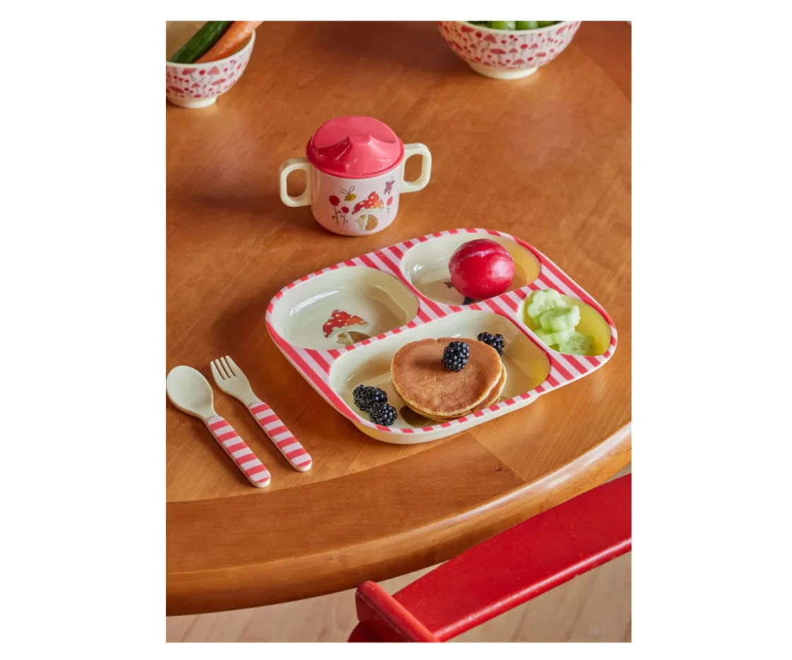 - Incluye: 1 plato con 4 compartimentos, tenedor, cuchara y taza con boquilla y asas