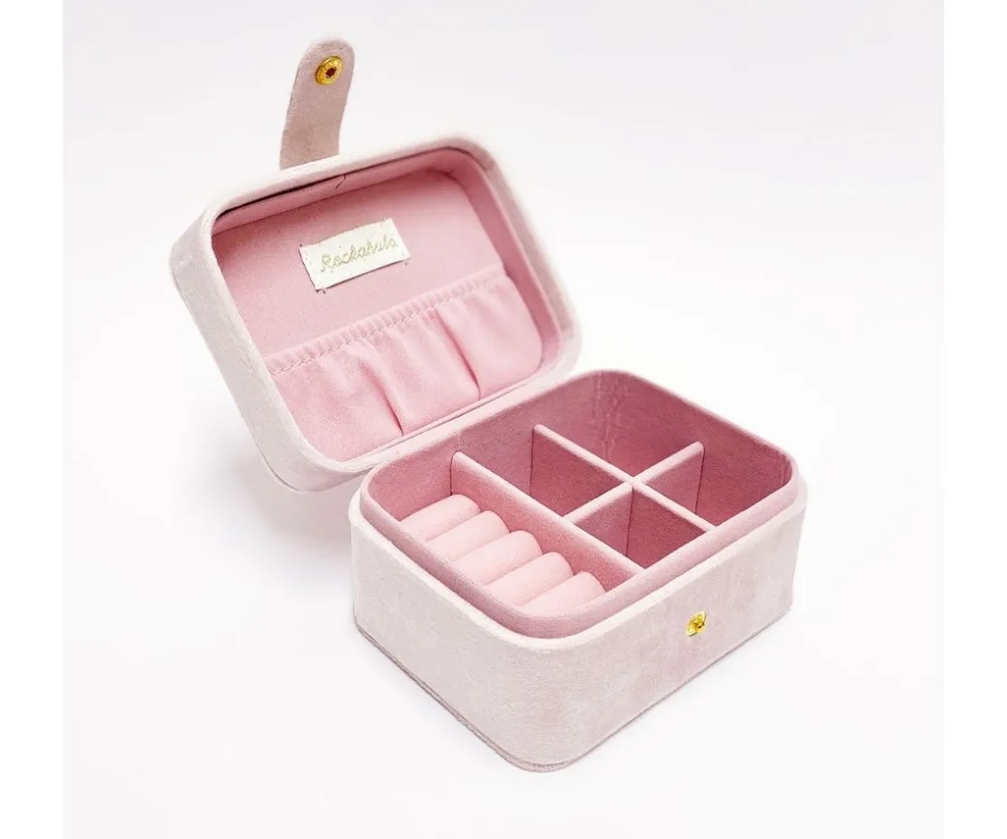 Precioso joyero de terciopelo supersuave que será el lugar perfecto donde guardar a salvo todas tu joyas y tus tesoros favoritos. Con un hermoso arcoiris bordado en la parte superior y cierre automático que esconde cuatro compartimentos, un bolsillo abierto y un espacio para colocar anillos.