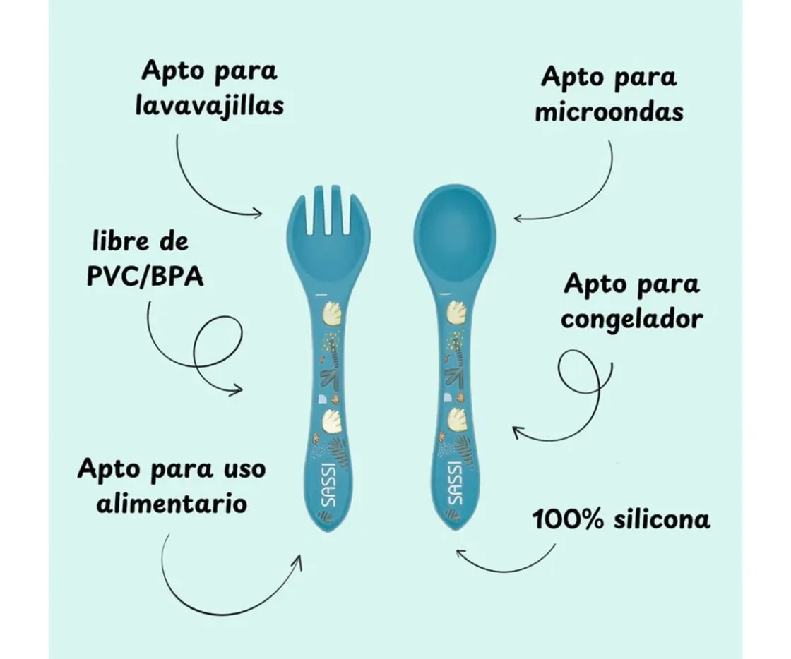 Un tenedor y una cuchara de silicona con forma redondeada, flexibles y agradables al tacto ideales para acompañar a los peques en sus primeros contactos con la comida sólida de forma autónoma.