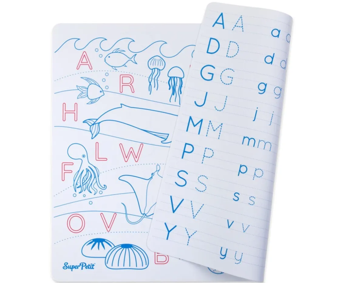 Este set mini de Super Petit es un salvamantel de silicona súper suave, ideal para que los más pequeños coloreen y aprendan las letras del alfabeto con dibujos de animales marinos, ¡en cualquier lugar!