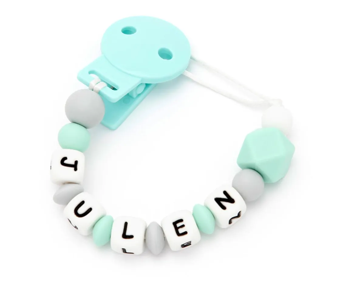 Chupetero 100% mordisqueable de Silicona alimentaria antibacteriana, personalizable con el nombre del bebé para que sea una pieza única y original.