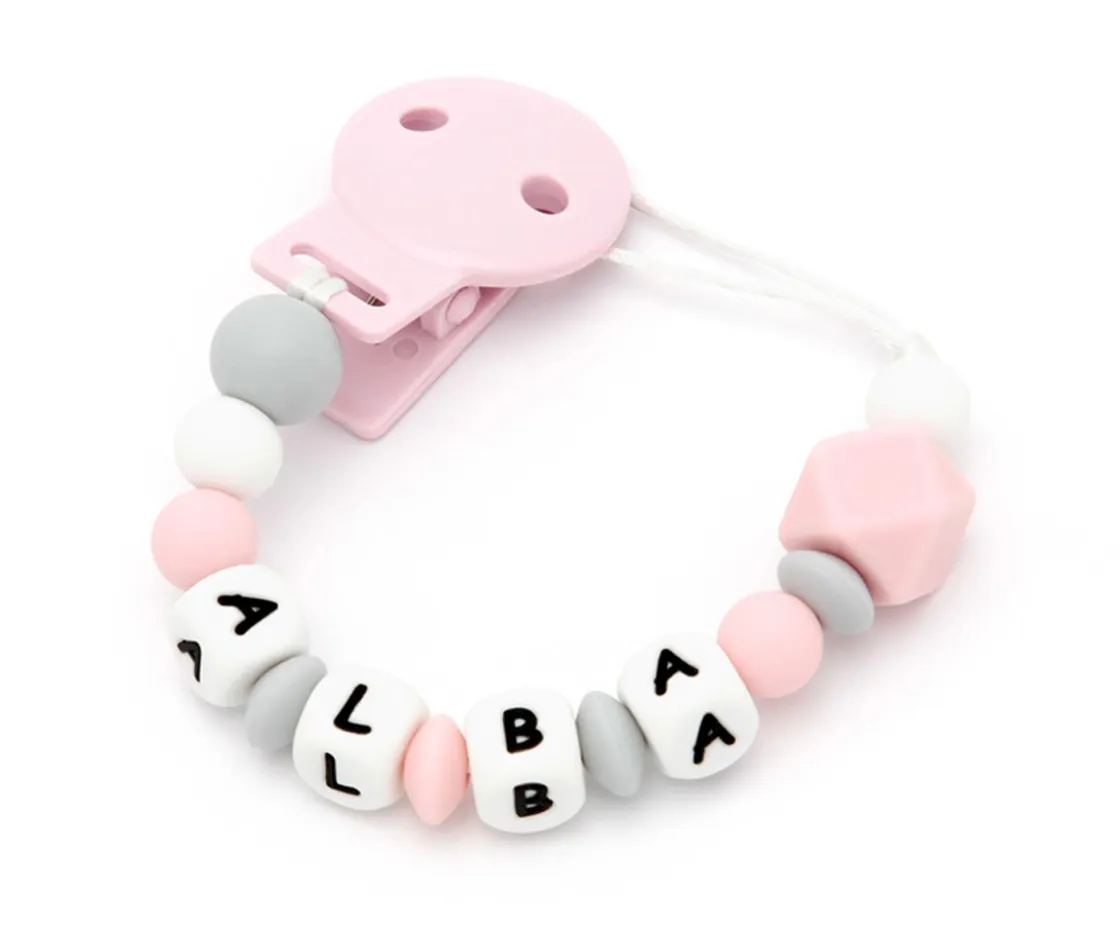 Chupetero 100% mordisqueable de Silicona alimentaria antibacteriana, personalizable con el nombre del bebé para que sea una pieza única y original.