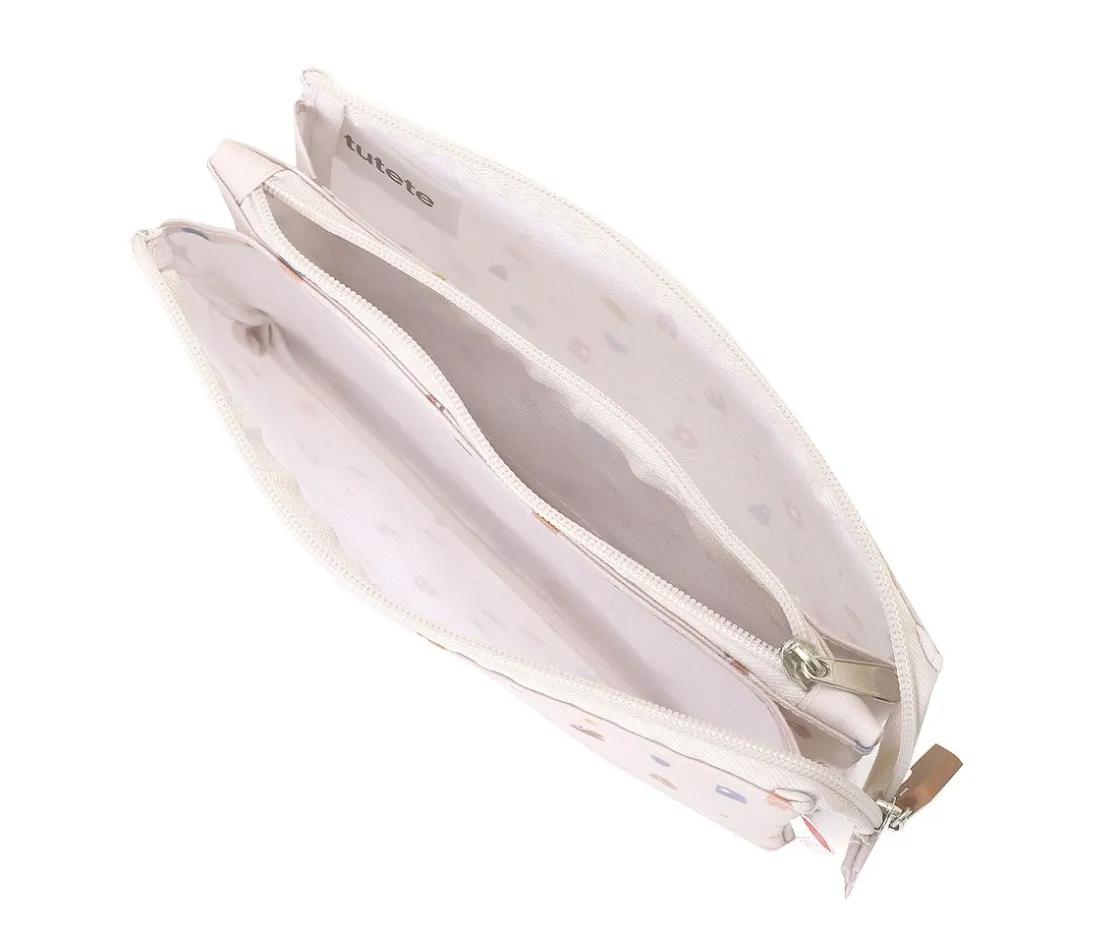 Lápices, rotuladores, ceras… todo en su sitio con el estuche de 3 compartimentos de Tutete. Su diseño combina tonos suaves y pequeños motivos geométricos inspirados en la naturaleza, ideal para familias que buscan un estilo moderno, neutro y funcional.