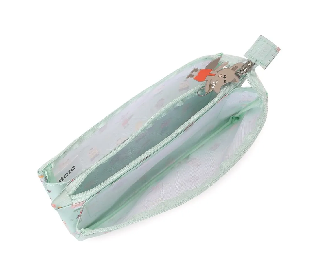 Dispone de una cremallera principal que abre paso a tres compartimentos interiores bien separados, perfectos para organizar el material por tipo o uso. El compartimento central también tiene su propia cremallera interior para mayor seguridad. El estuche se completa con un tirador decorativo de silicona que añade un toque divertido y fácil de manipular.