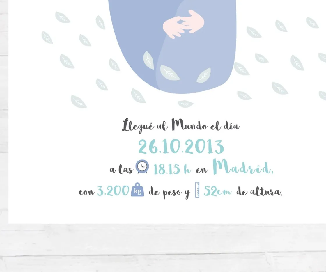 Lámina de nacimiento para personalizar con el nombre del bebé y con sus datos de nacimiento. Ideal para decorar su habitación y tener un bonito recuerdo de su llegada al mundo.
