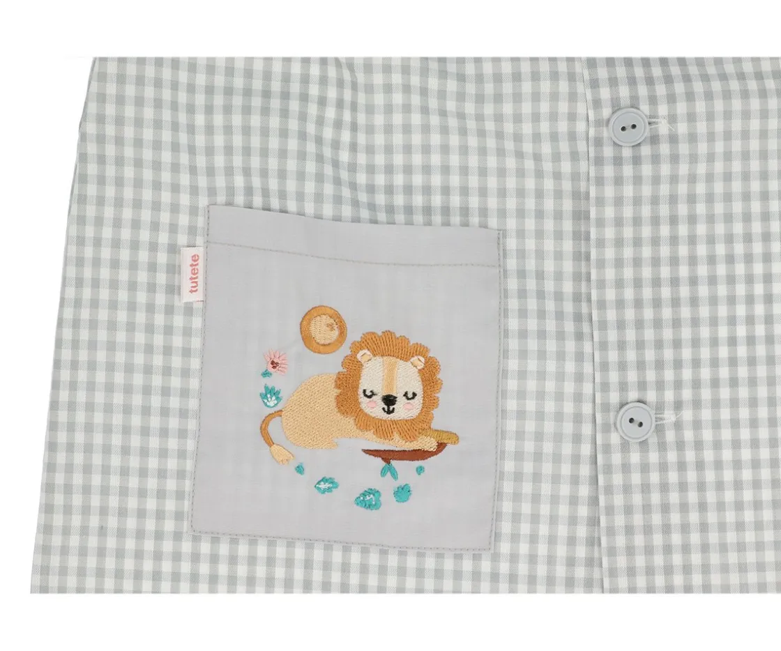 Fabricados especialmente para Tutete por fabricantes especializados en grandes marcas, los babis Seber cierran en la parte delantera mediante botones y cuentan con un bolsillo bordado con los originales diseños de la Vuelta al Cole 2024 de Tutete.