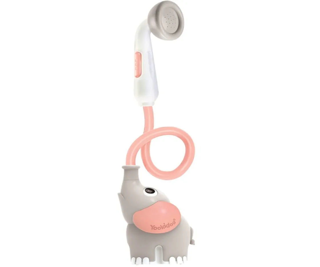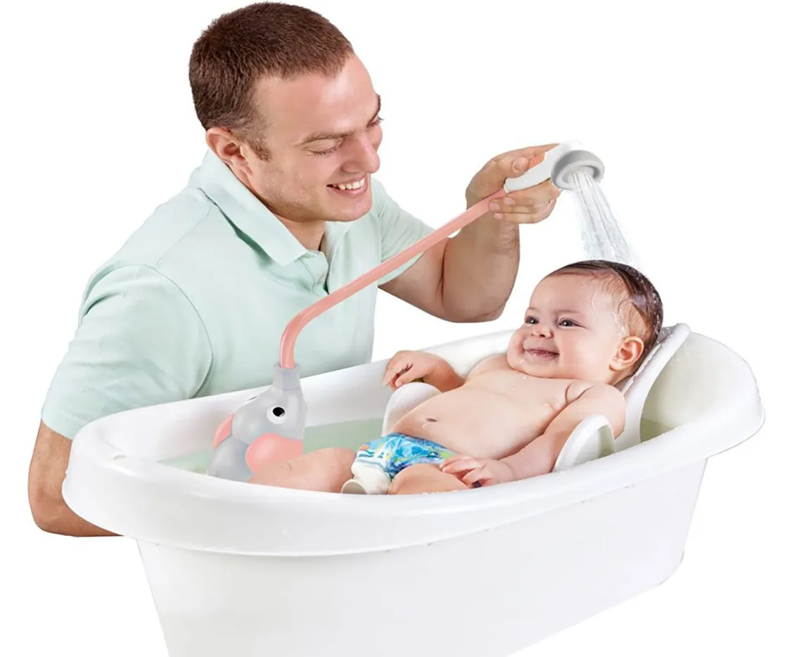 La trompita del elefantito se convierte en una ducha de bebé portátil que con un simple botón de encendido / apagado se enciende para extraer un chorro de agua.